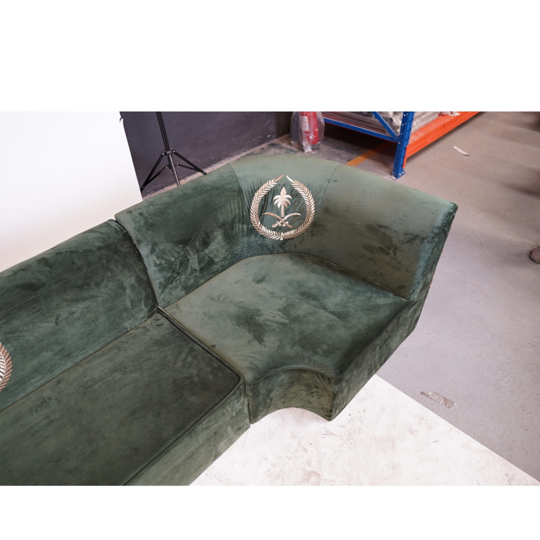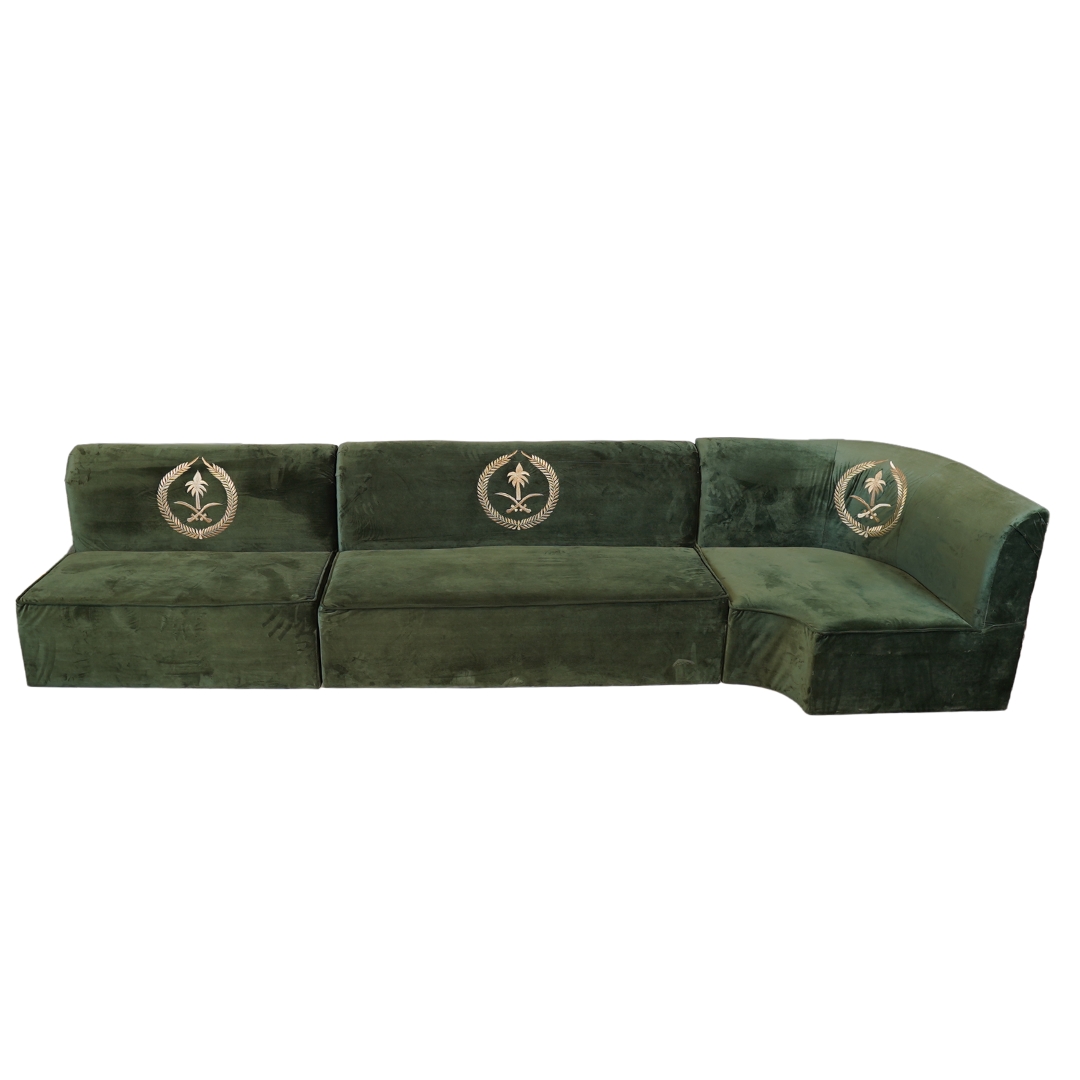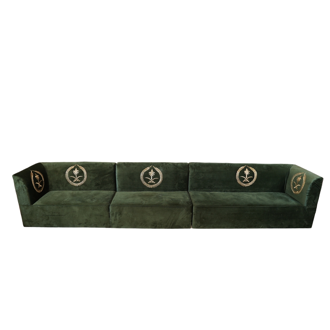 The Floor Sofa Set in Olive Green with Saudi Patterns is a cultural masterpiece that seamlessly blends comfort and tradition. This unique piece of furniture pays homage to the rich heritage of Saudi Arabia, marrying the elegance of olive green upholstery with intricate Saudi patterns. It has some signs of use.