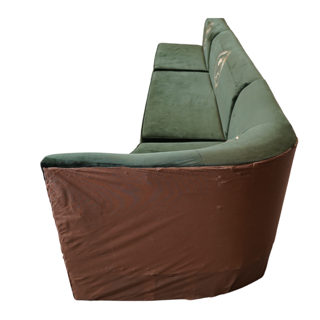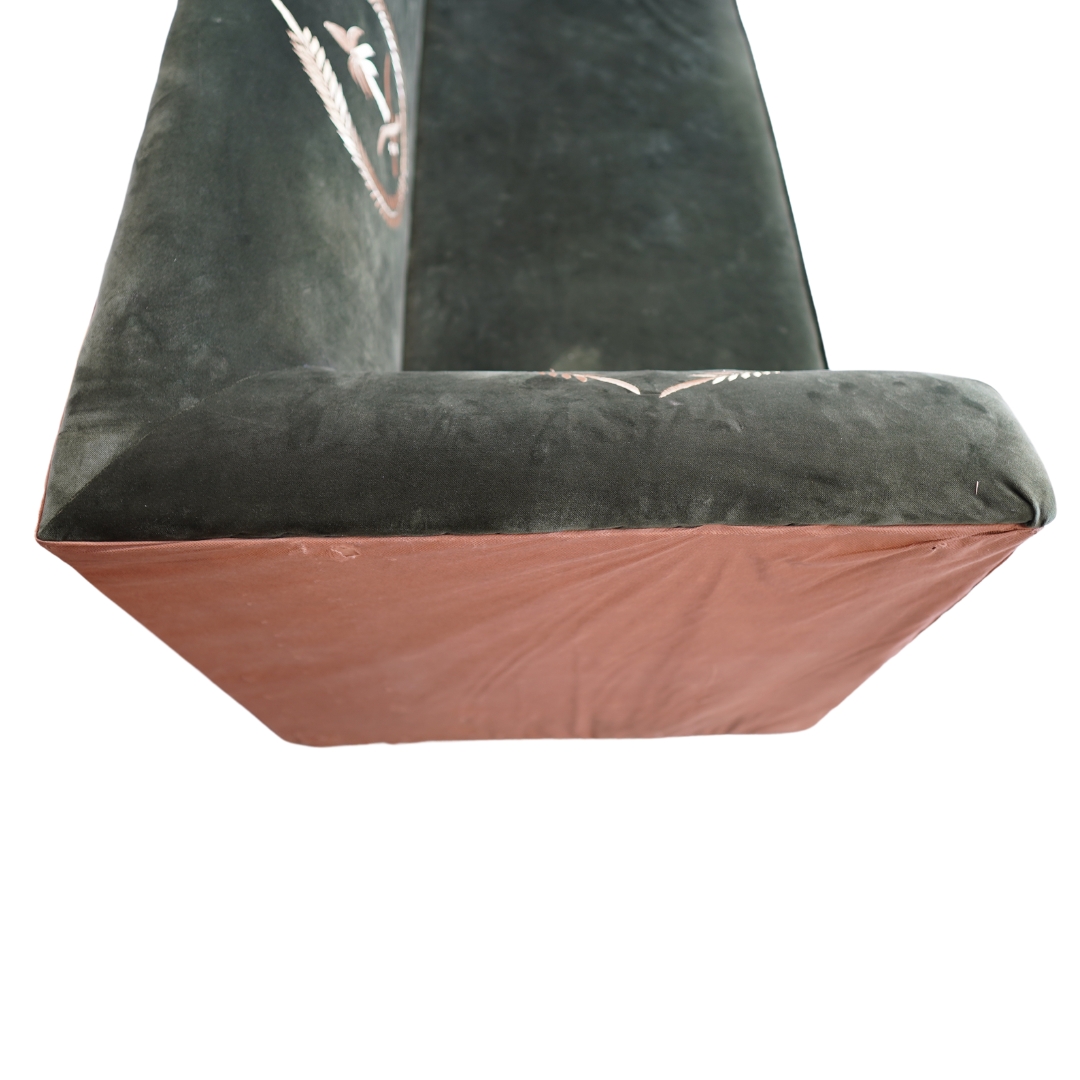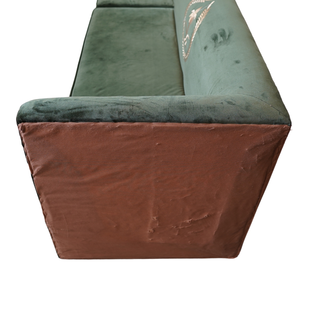 The Floor Sofa Set in Olive Green with Saudi Patterns is a cultural masterpiece that seamlessly blends comfort and tradition. This unique piece of furniture pays homage to the rich heritage of Saudi Arabia, marrying the elegance of olive green upholstery with intricate Saudi patterns. It has some signs of use.
